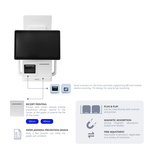 The PN10X is adaptable to any retail setup — it is designed for seamless switching between cashier and self-checkout modes. Ideal for both compact counters and large-scale operations. It is distinctive because it features dual scanners on both the front and back, along with a built-in receipt printer designed to prevent paper jams. It has a modular design where you can mix and match the printer, scanner, and display.